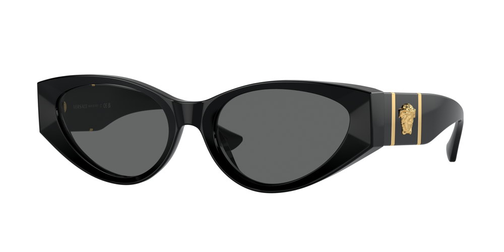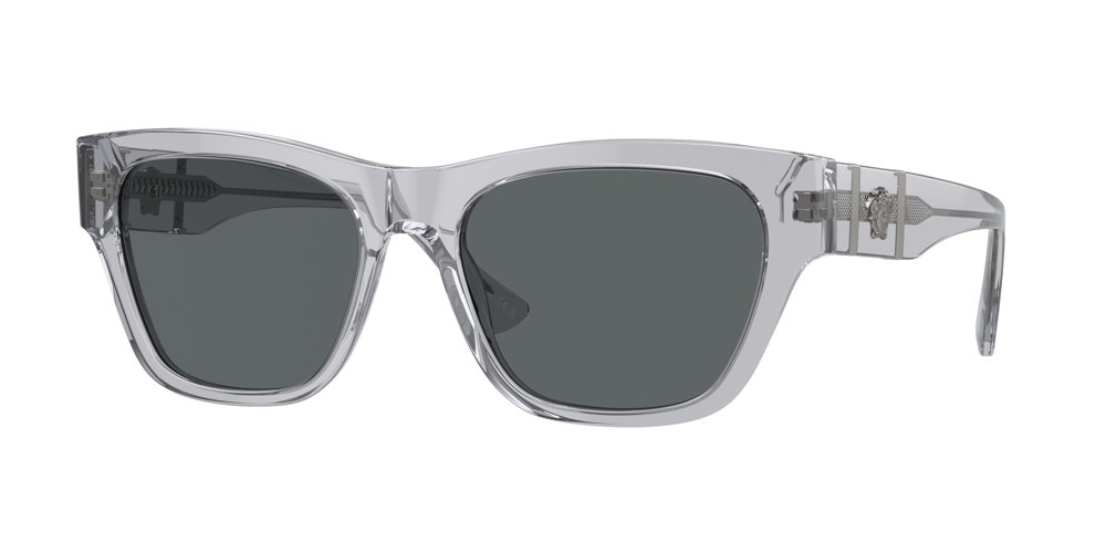 Armazón completamente metálico con el logotipo de Versace grabado en el puente. El emblema de Medusa en relieve en la patilla complementa la estructura, y está disponible en color violeta o dorado con lentes en gris oscuro.