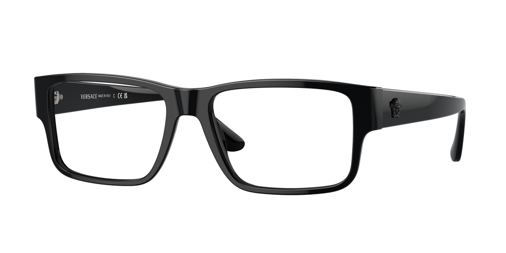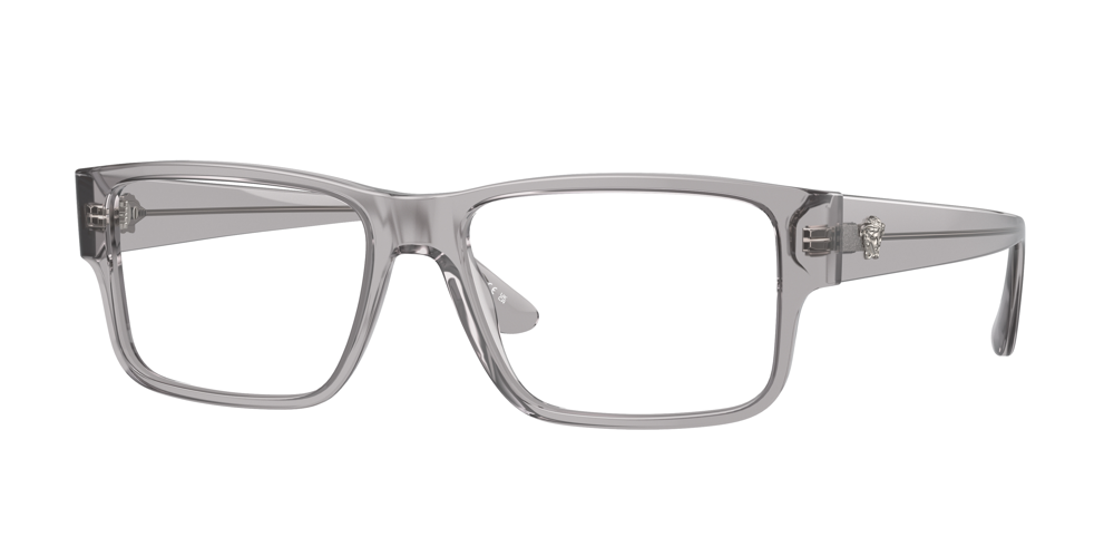 Armazón rectangular de acetato reciclado con extremos ajustables y un emblema de Medusa en relieve en la patilla. El diseño de vista se ofrece en color gris transparente o negro clásico.