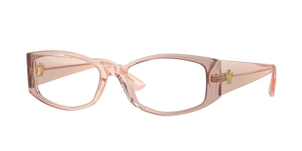 Armazón cuadrado redondeado de acetato reciclado con patillas metálicas ajustables en contraste y un emblema de Medusa en relieve en el lateral. Disponible en color melocotón degradado, beige y negro.